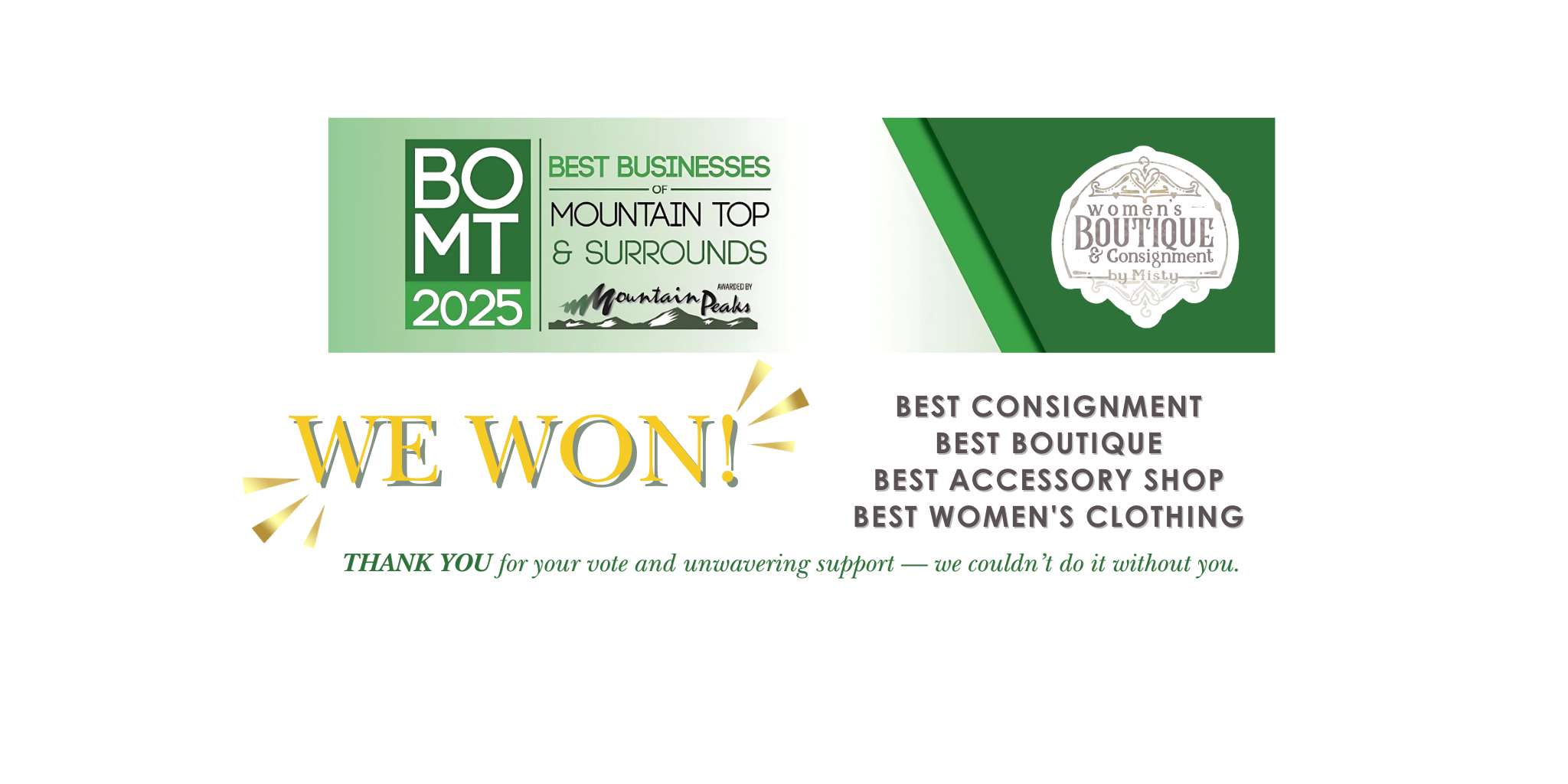 Women’s Boutique and Consignment is a proudly women founded and woman owned community mainstay for over 11 years. Women’s Boutique and Consignment in Mountain Top, PA is a women centric shopping experience dedicated to offering fun, chic, and stylish fashion. Featuring jewelry, accessories, sunglasses, gifts, pre-loved clothing and shoes, the Boutique is worth adding to your seasonal shopping rotation because there are always amazing treasures on the racks waiting to be discovered!
