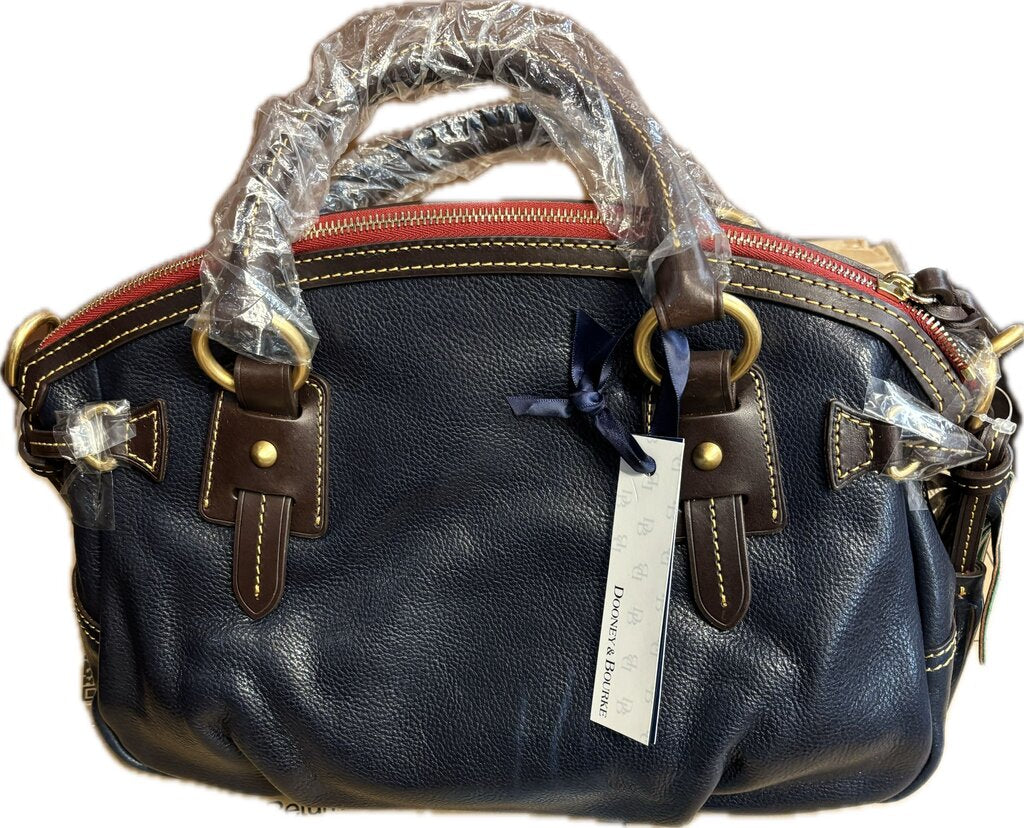 Stylish Dooney & Bourke small satchel handbag in navy, perfect for everyday use. Features sturdy handles and an elegant design.