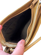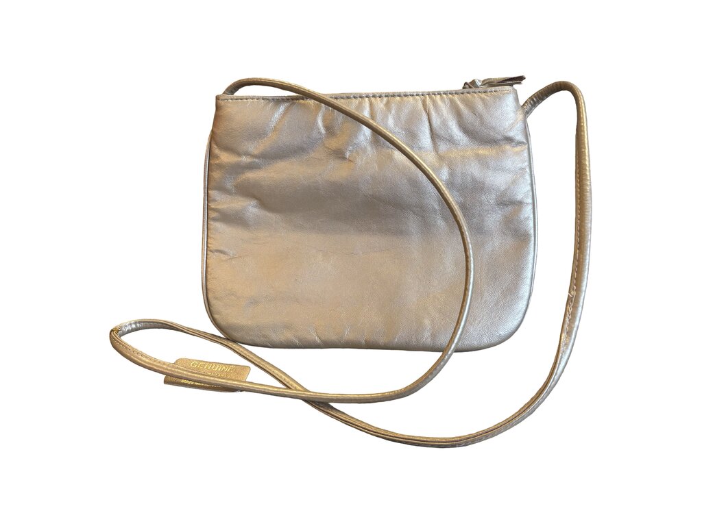 Stylish gold crossbody handbag with zip closure and adjustable strap, perfect for day or night outings.