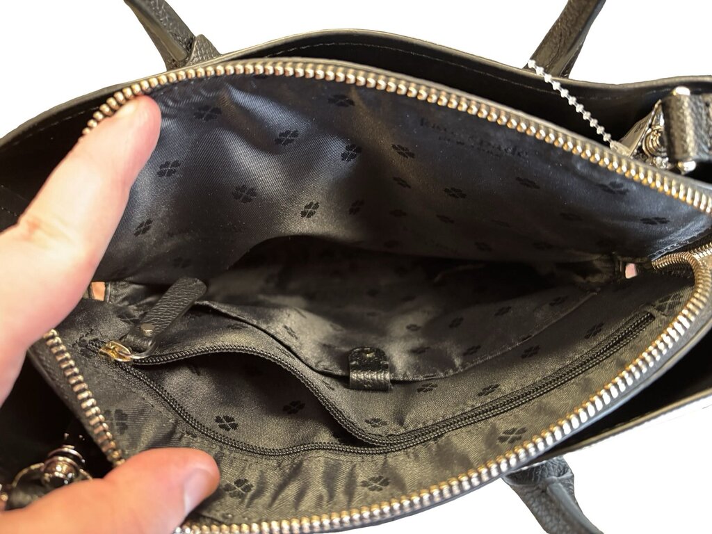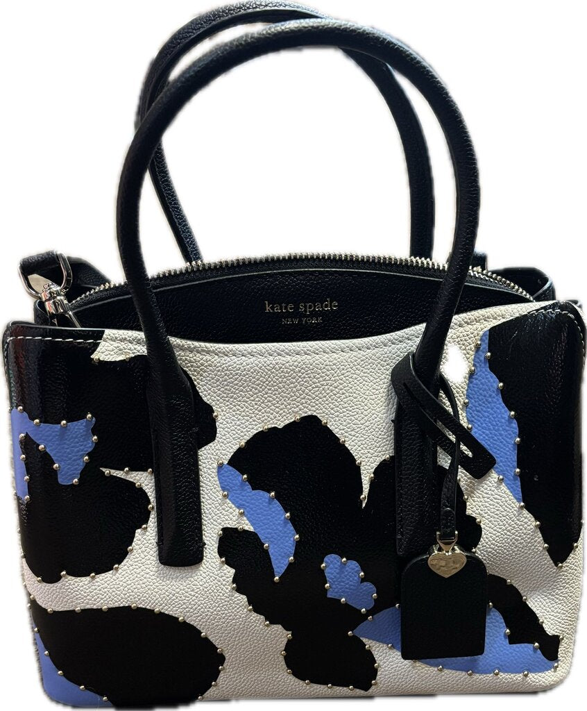 Stylish Kate Spade New York handbag featuring a floral print in black, white, and blue. Perfect for everyday use or special occasions.
