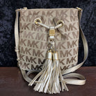 Stylish and functional Michael Kors crossbody bag featuring a logo print design and a chic tassel accent. Perfect for everyday use or a night out.