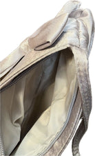 A stylish silver purse featuring a decorative bow, perfect for evening outings or special occasions.
