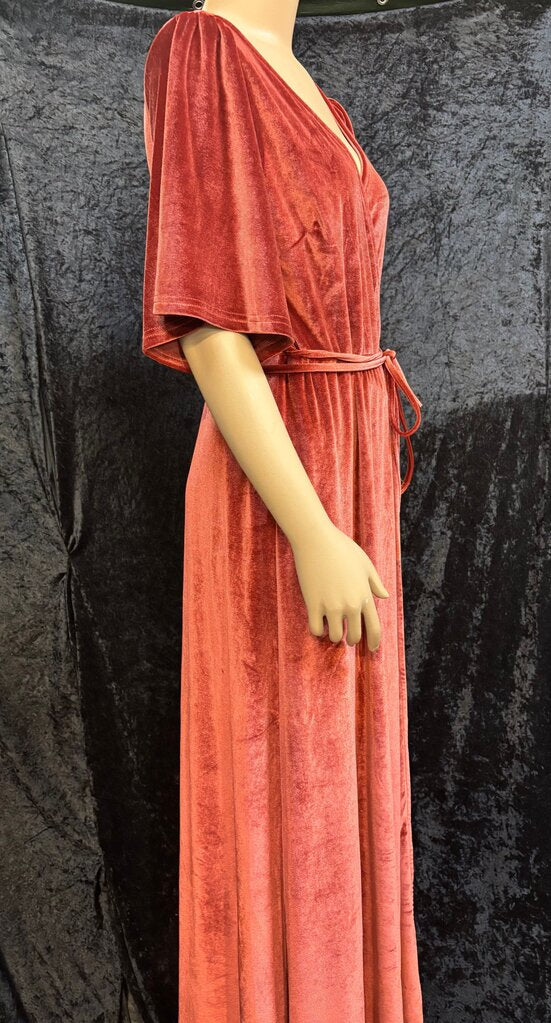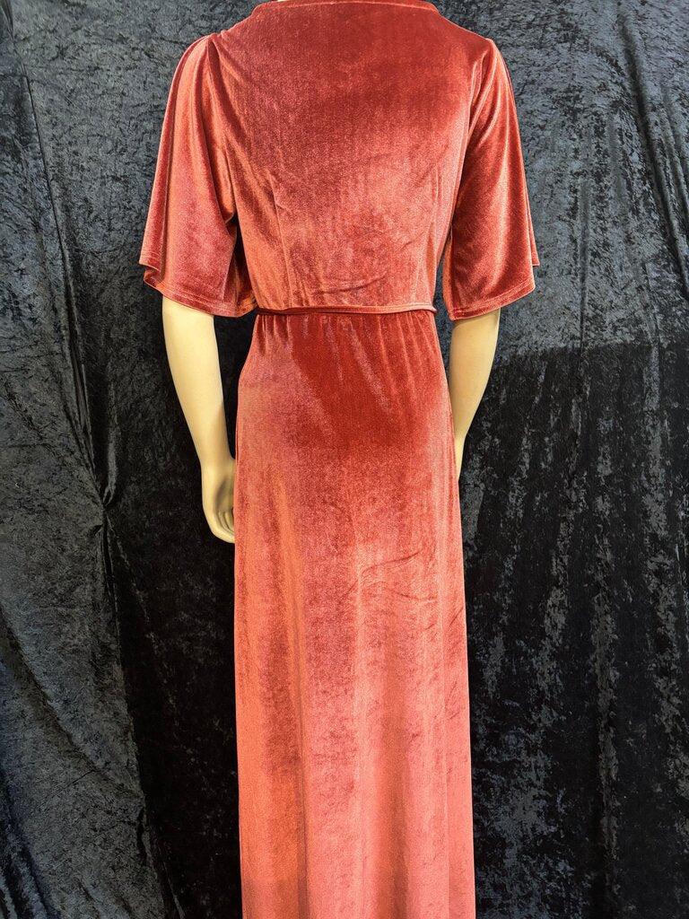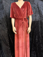 A beautiful long velvet wrap dress featuring short sleeves and a waist tie for a flattering fit. Perfect for elegant occasions or casual wear.
