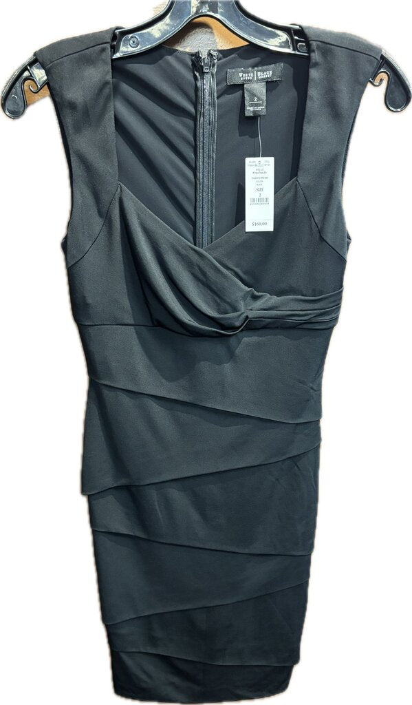 Elegant sleeveless black dress from White House Black Market, perfect for formal occasions or night outs. Features stylish draping and a flattering fit.