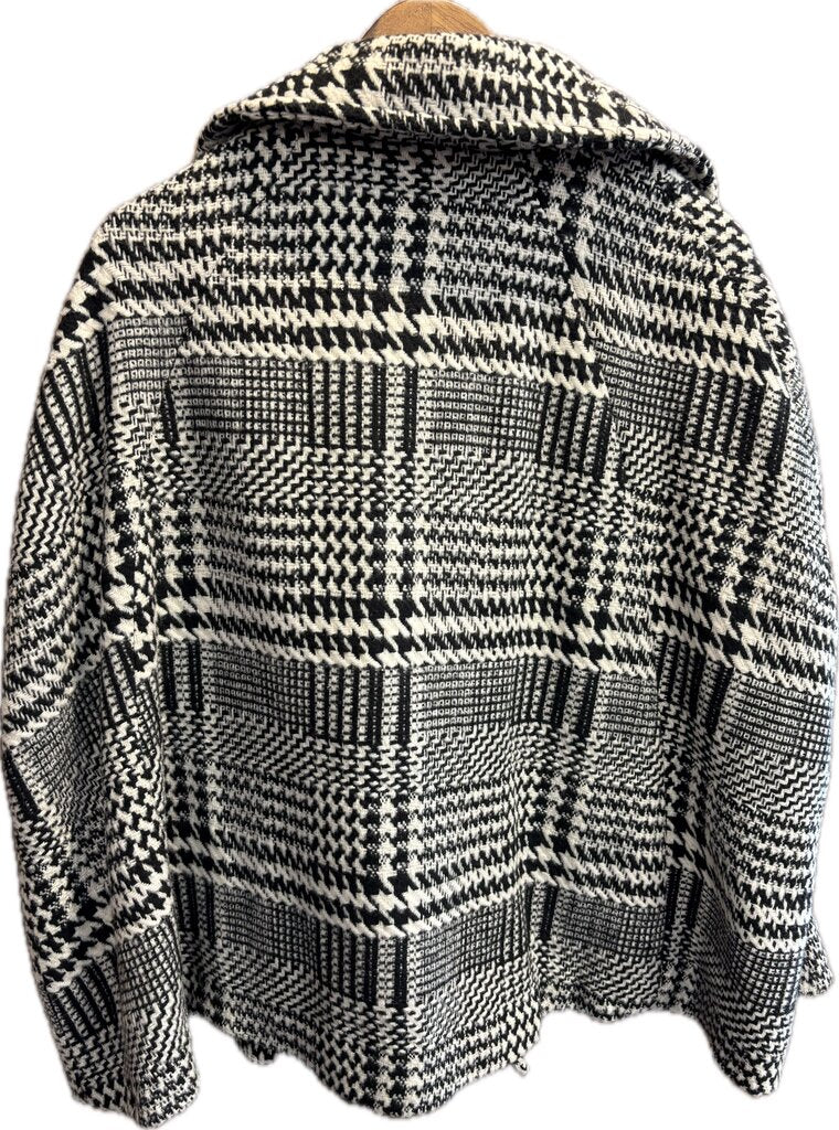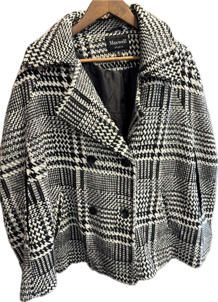 Stylish Maxwell Studio double-breasted jacket featuring a chic houndstooth pattern, perfect for layering in cool weather.