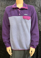 Comfortable and warm Patagonia Synchilla fleece pullover in purple, perfect for layering on chilly days.