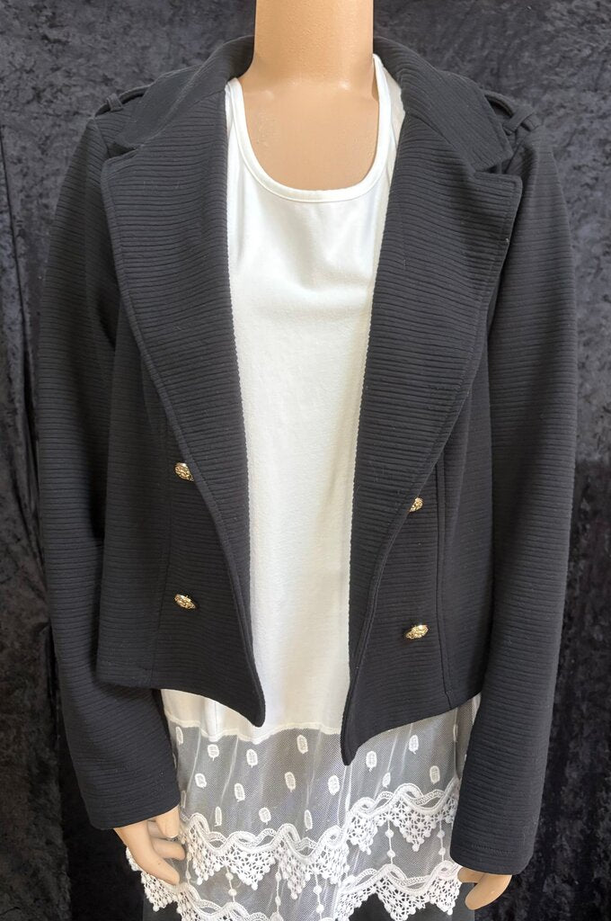 Stylish and versatile black jacket from Torrid, perfect for layering in cooler weather. Features a textured design and unique button details.