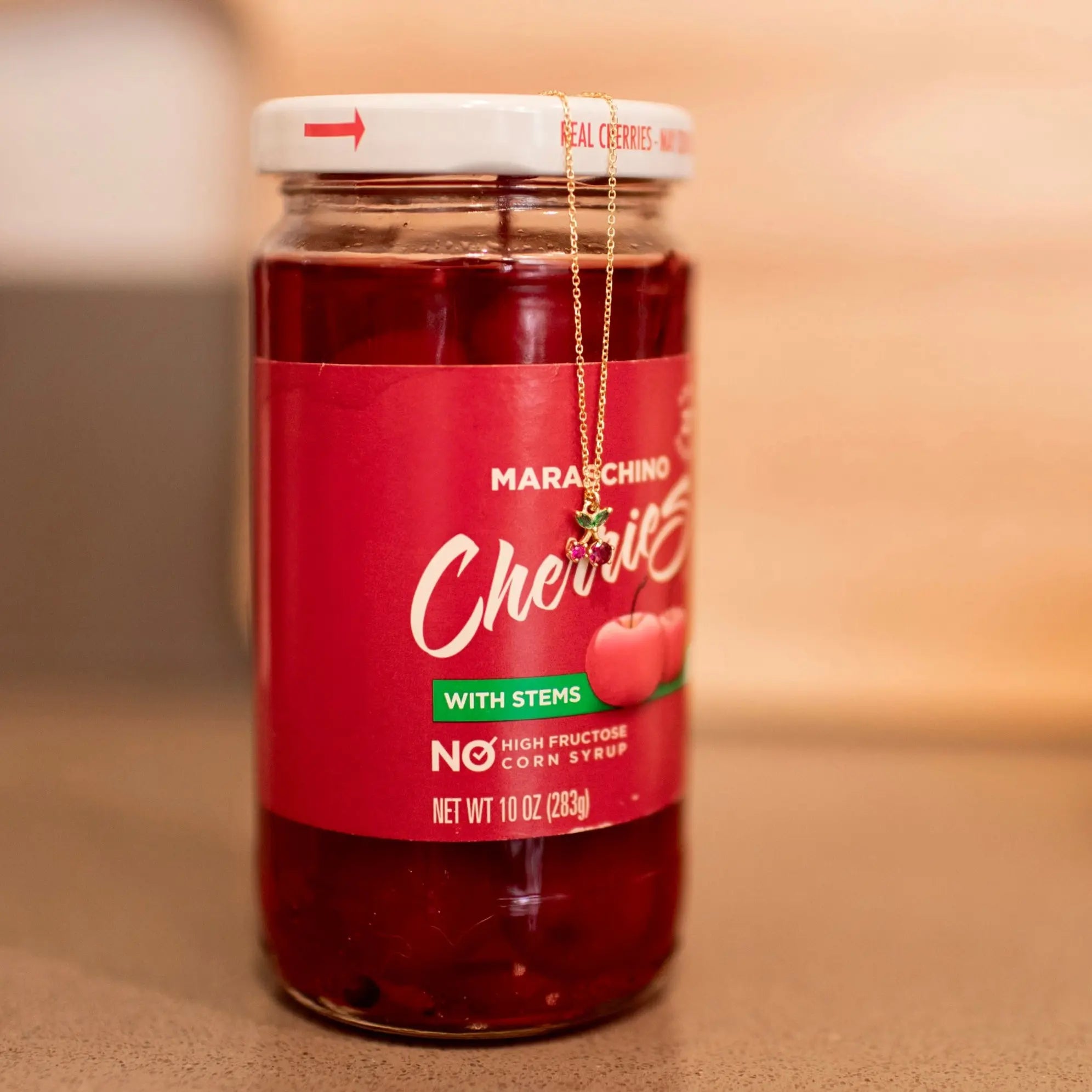 Pendant features tiny cherries made of imitation ruby red stones and dainty stems made of imitation light emerald green stones. Chain is a thick layer gold fused to a hypoallergenic sterling silver base.