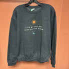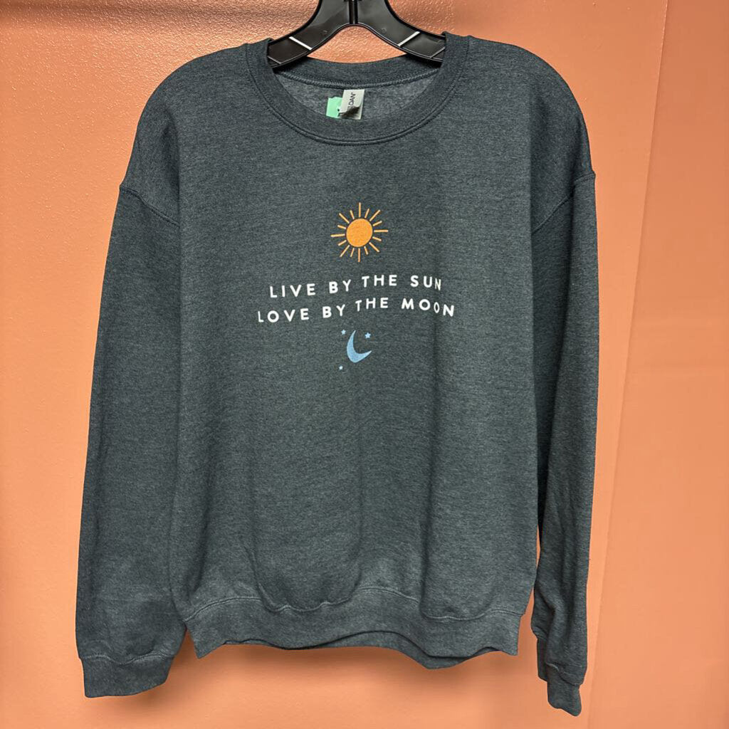 Cozy gray sweatshirt featuring a vibrant sun and moon design with the phrase 'Live by the Sun Love by the Moon'. Perfect for casual wear or lounging.