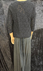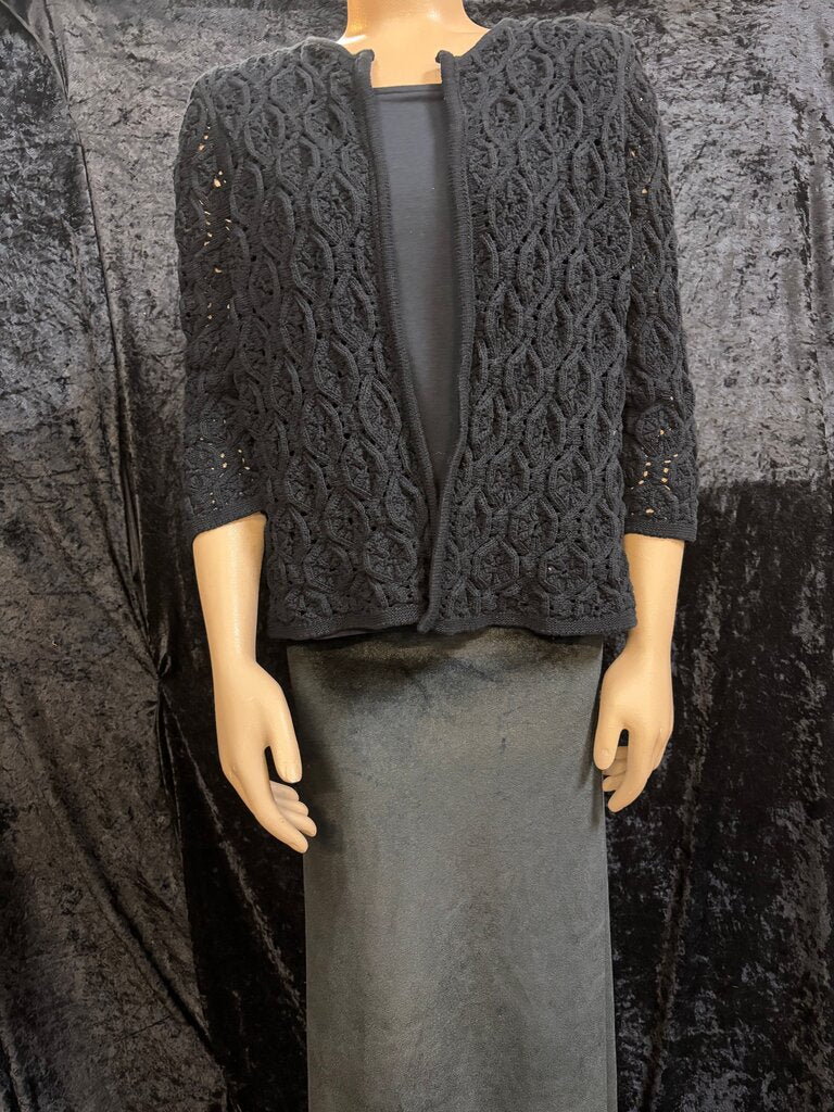 A beautifully crafted lace patterned black cardigan, perfect for layering. Ideal for both casual and formal occasions. Its intricate design provides a stylish yet comfortable fit for women.