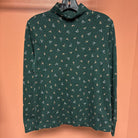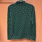 A cozy green long sleeve turtleneck top featuring a fun Christmas pattern with reindeer and snowflakes, perfect for the holiday season.