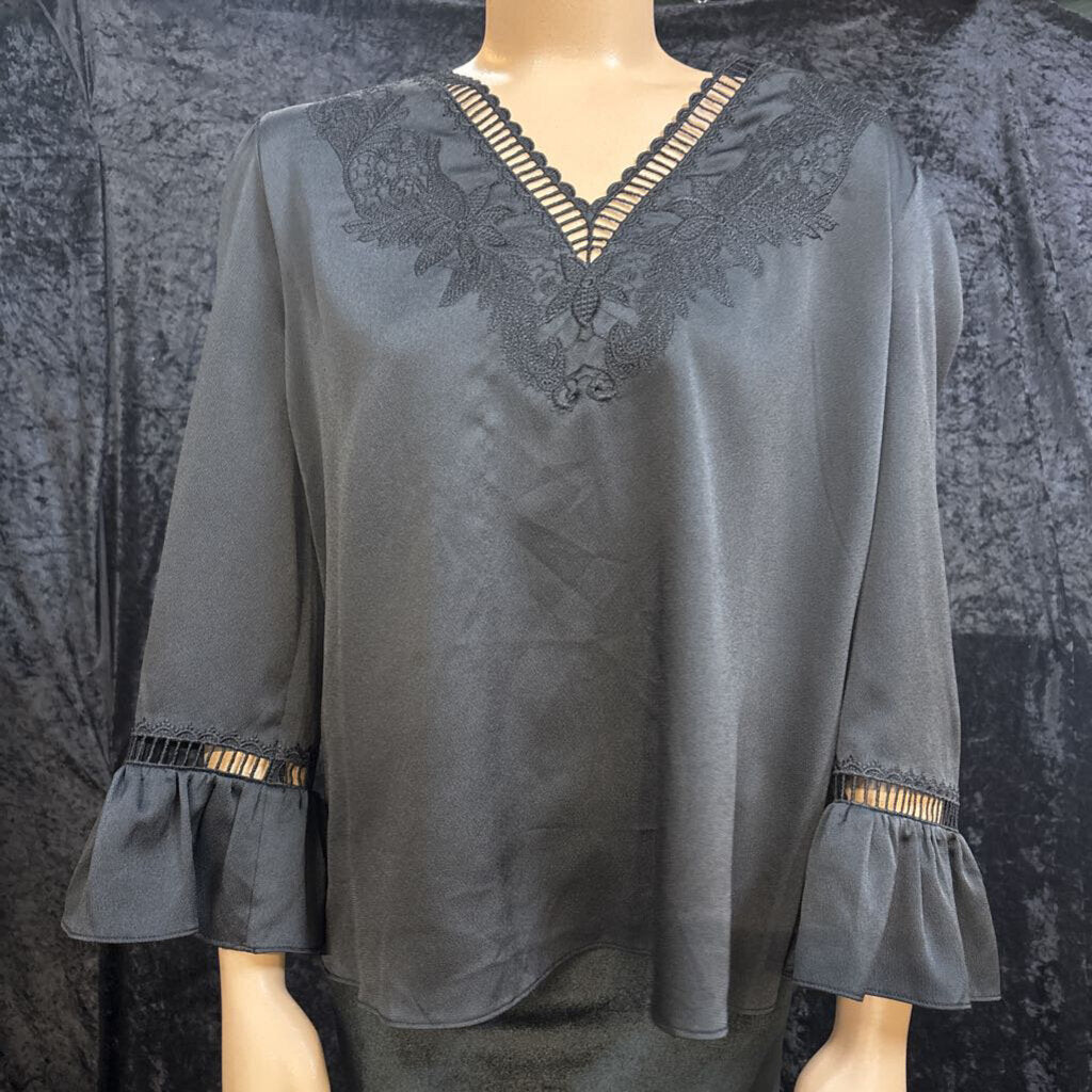 Laundry by shelli Segal Embroidered v neck with cut out lace trim Women's Shirts M Black