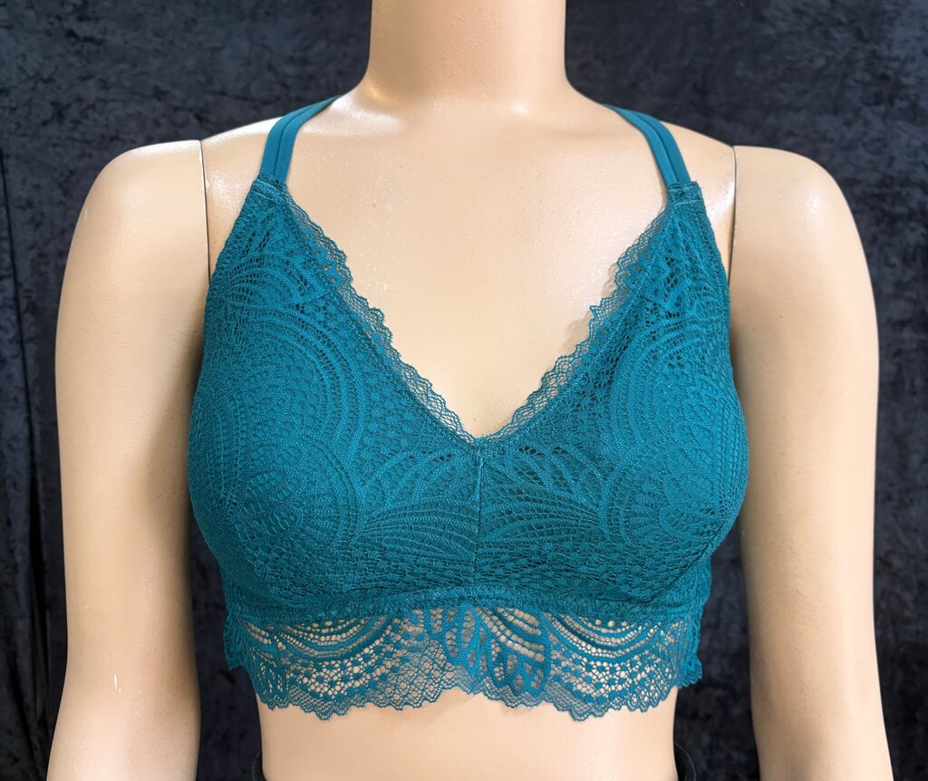 Stylish teal lace bralette from Maurices, perfect for layering or comfort. Features intricate lace detailing and adjustable straps for a perfect fit. Ideal for everyday wear or special occasions.