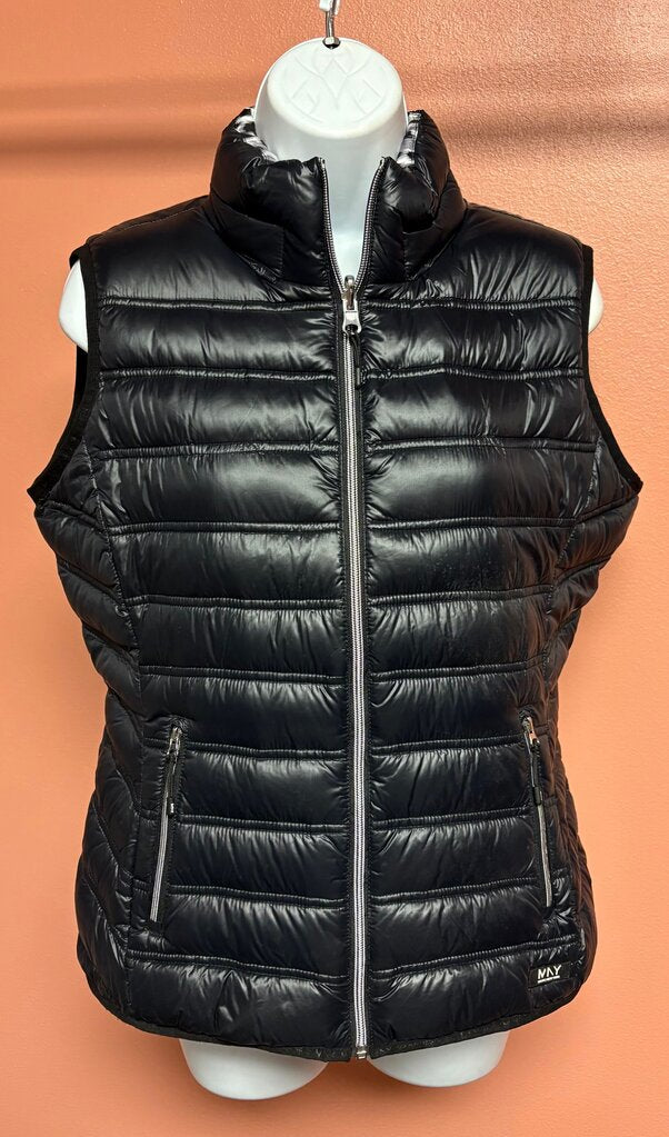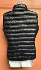Stylish and warm black puffer vest with a zip closure and pockets, perfect for layering in cooler weather.