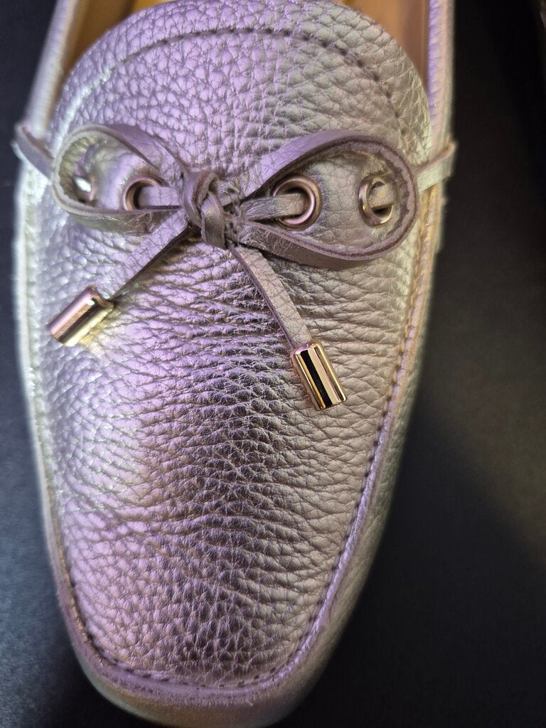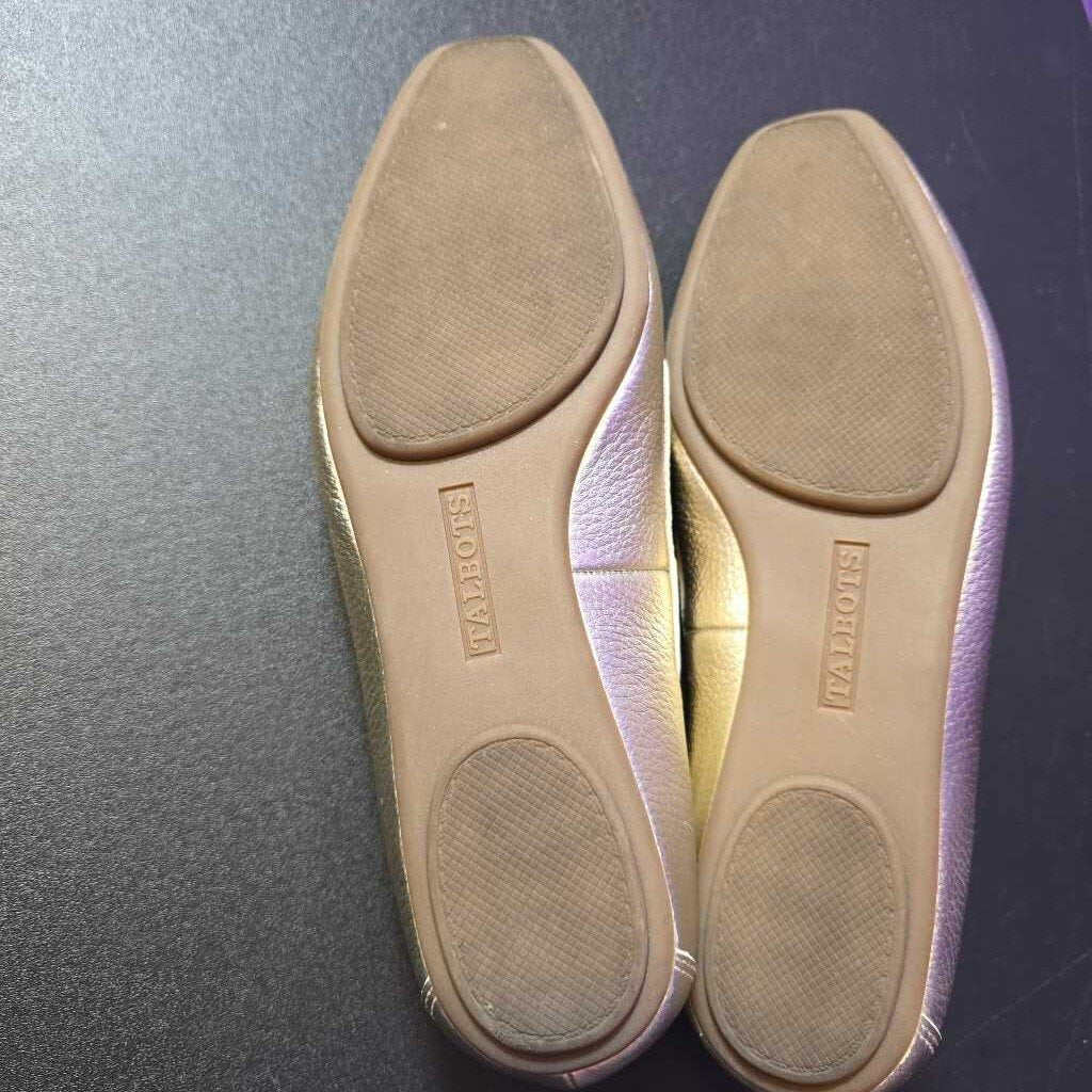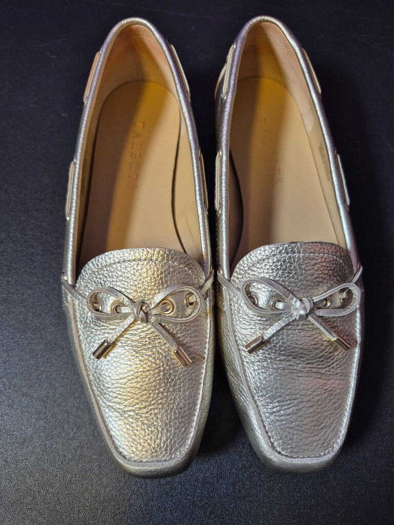 Stylish Talbots metallic leather loafers perfect for casual or semi-formal occasions. Comfortable and chic with a refined look, featuring lace accents.