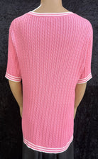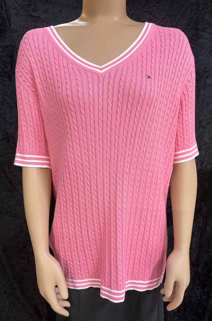 A stylish and comfortable Tommy Hilfiger women's pink v-neck sweater, featuring a ribbed design and short sleeves, perfect for casual wear.