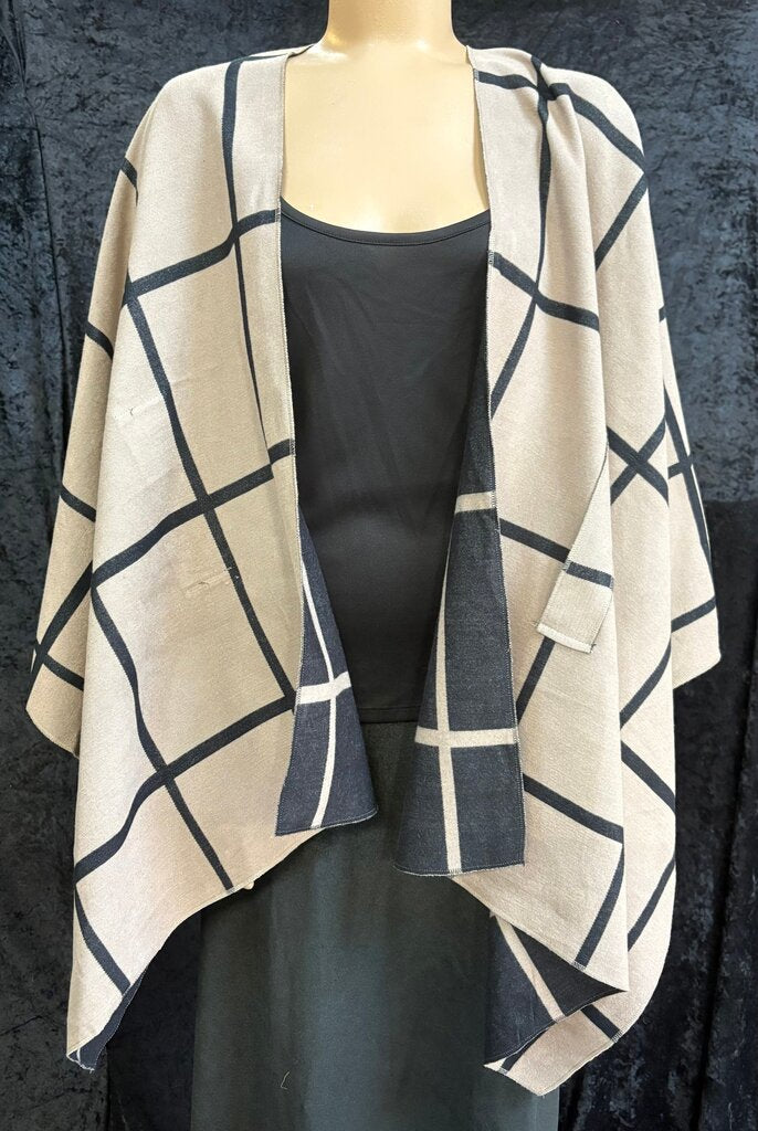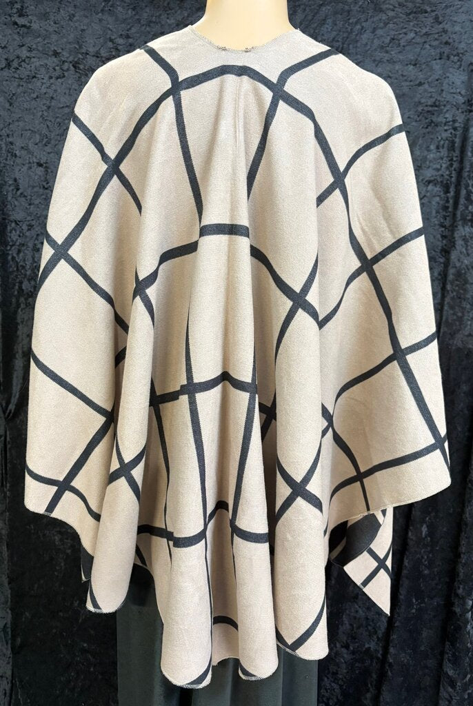 Stylish beige poncho featuring a black checkered pattern, perfect for layering in cooler weather.