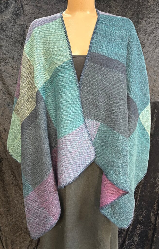 A vibrant multicolored knit poncho wrap perfect for layering in cooler weather. Soft and stylish, this piece adds a unique flair to any outfit.