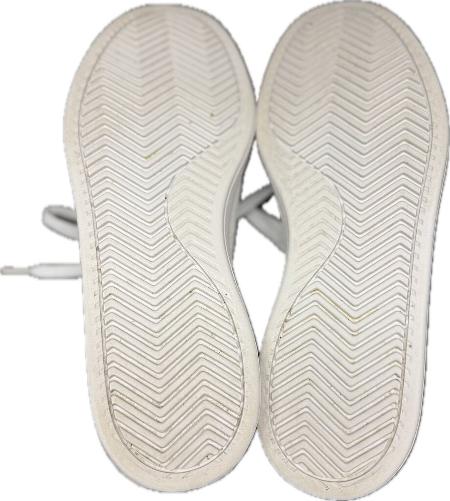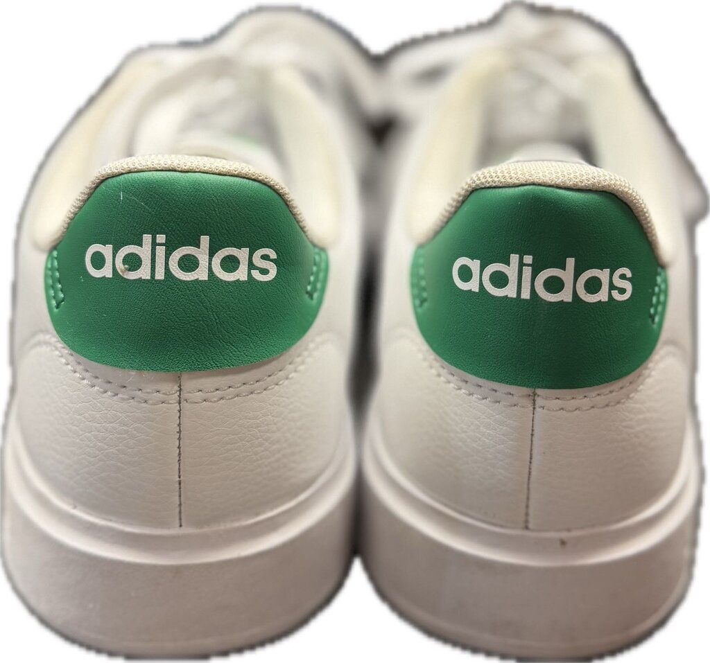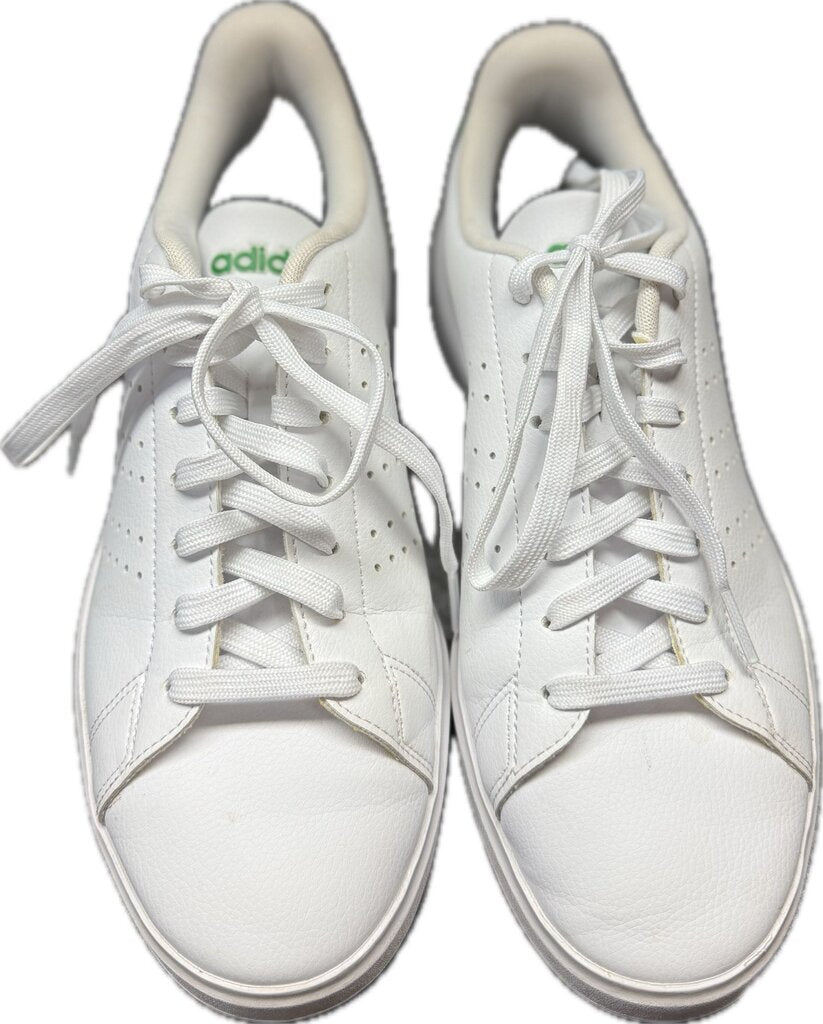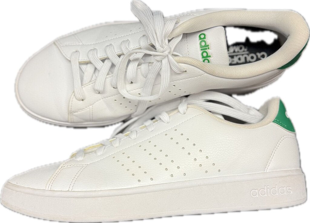 Stylish Adidas white sneakers featuring green accents, perfect for casual wear and daily activities. These shoes are pre-owned but in good condition, offering both comfort and style.