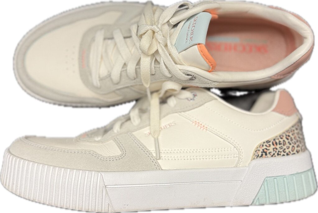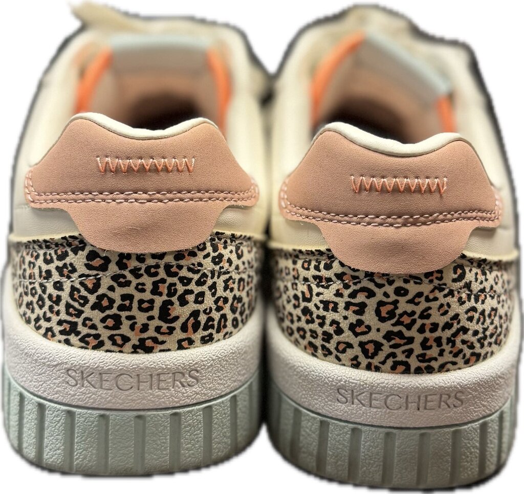 Stylish Skechers women's sneakers featuring a mix of white leather and leopard print accents, perfect for casual wear.