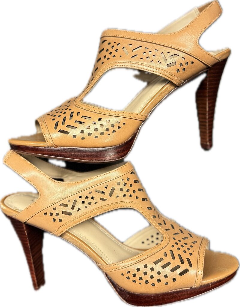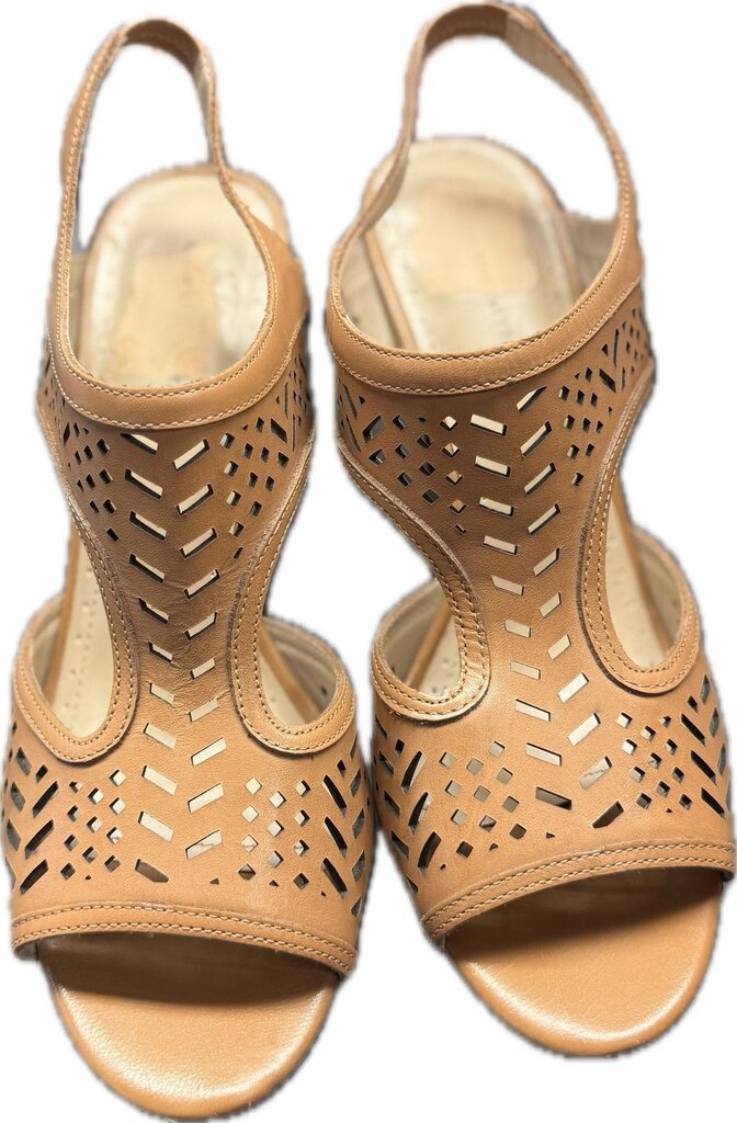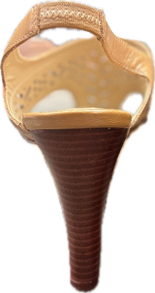 Stylish tan open-toe heeled sandals by Vittadini featuring intricate cut-out design and adjustable straps for comfort.