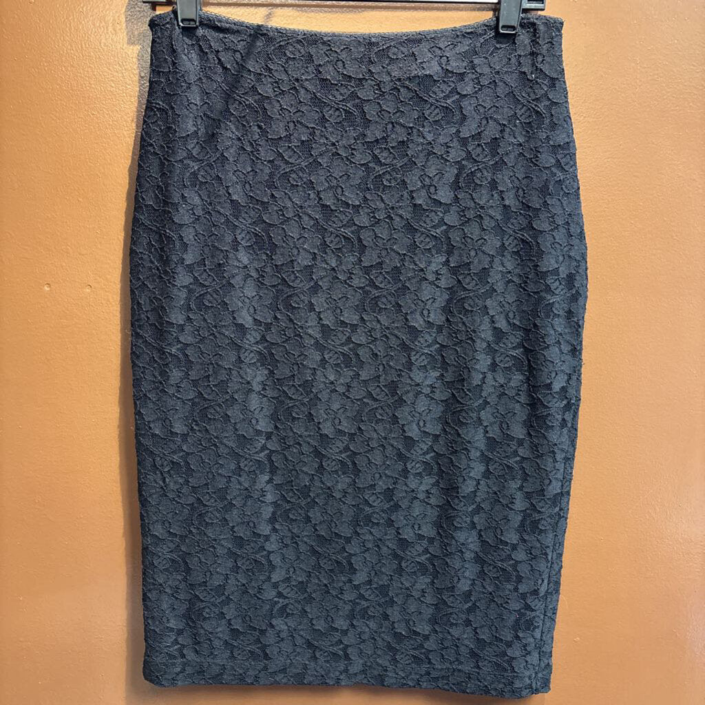 This women's express skirt is so fashionable. The lace pattern on this skirt adds so much dimension. This piece is a size 8 and mid length in the color black. Come check it out!