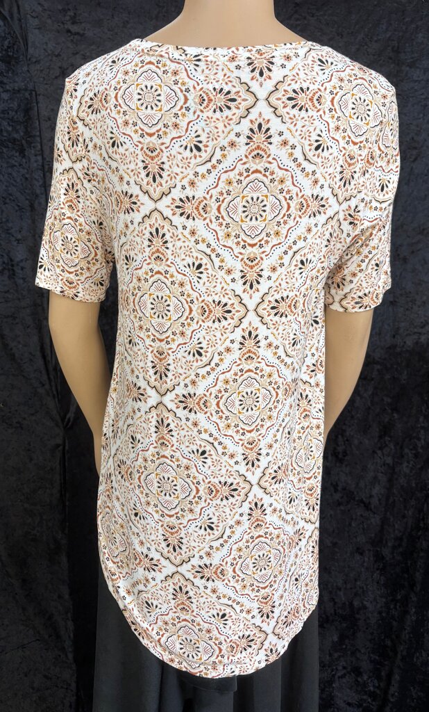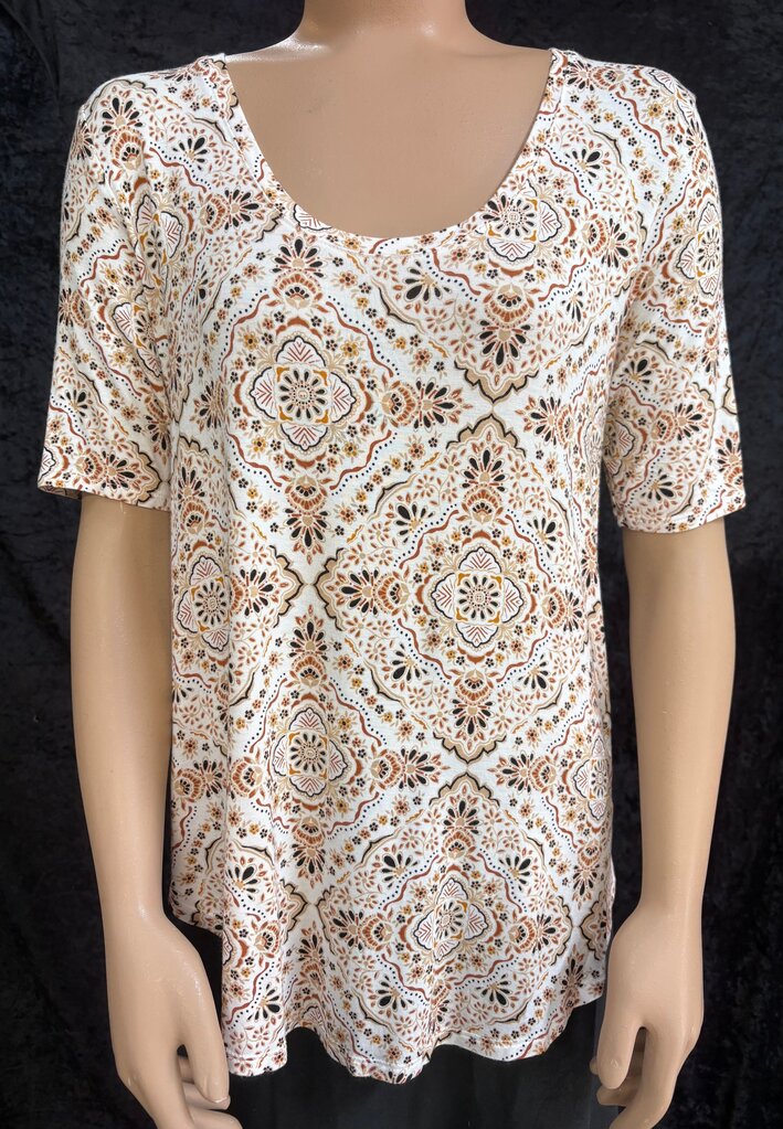 This 247 Women's Floral Print Top features a beautiful floral design in shades of orange and black, perfect for any casual occasion.
