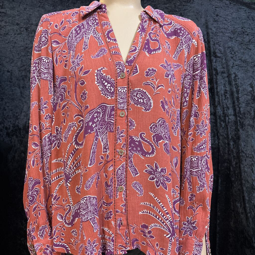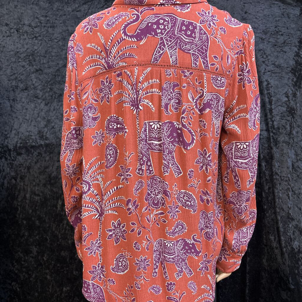 democracy Elephant & Leaf Patterned Women's Shirts Medium Orange/Burgundy