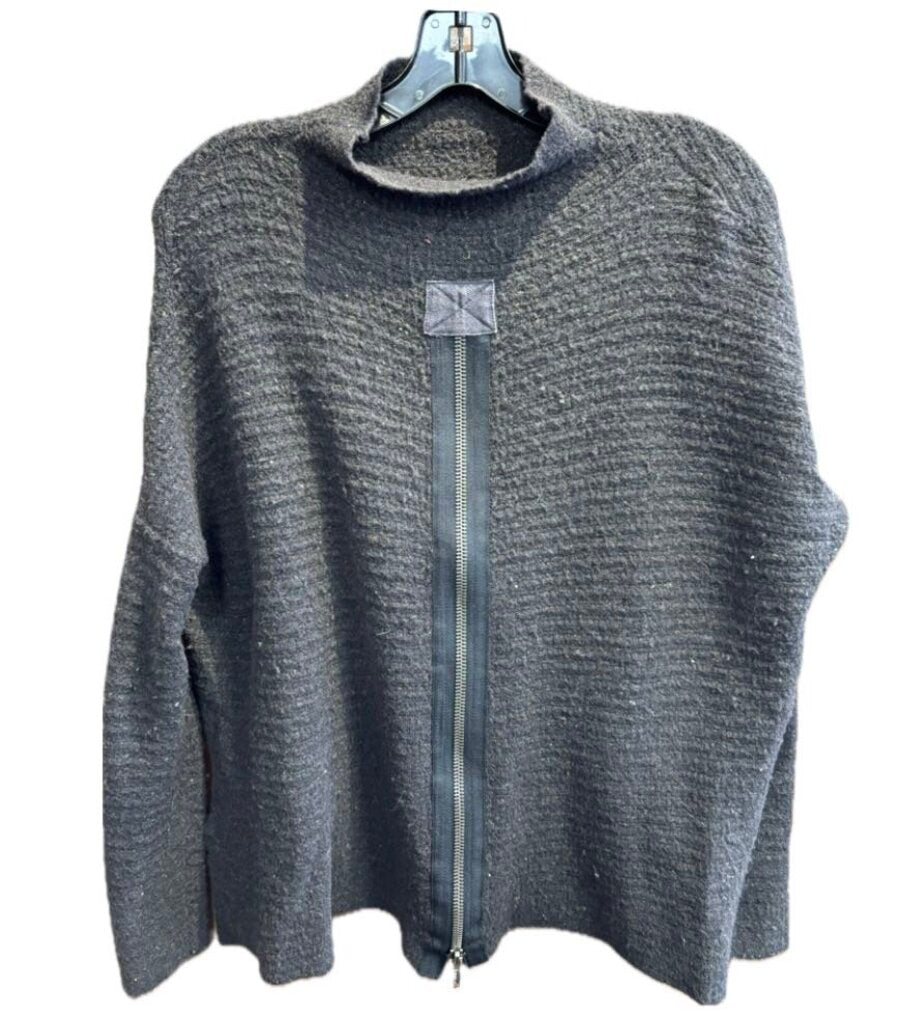 A cozy zip-up sweater in soft black fabric, perfect for layering in cooler weather.