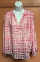 Stylish pink ombre print blouse featuring long sleeves and a relaxed fit, perfect for casual outings or layering.