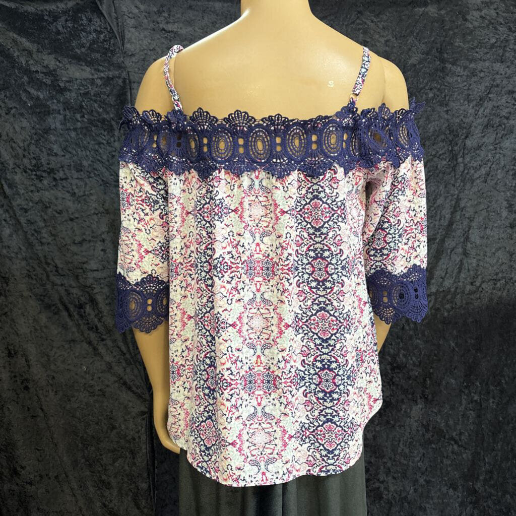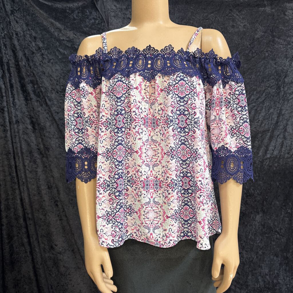 iz byer off shoulder with thin straps trimmed in lace Women's Shirts S navy, white, pink