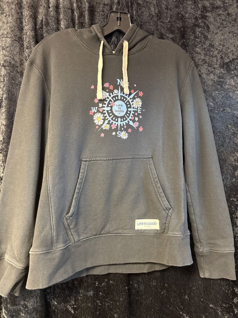 A comfortable and stylish gray hoodie featuring a floral compass design and the phrase 'Life is Good'. Perfect for casual outings and cozy days.