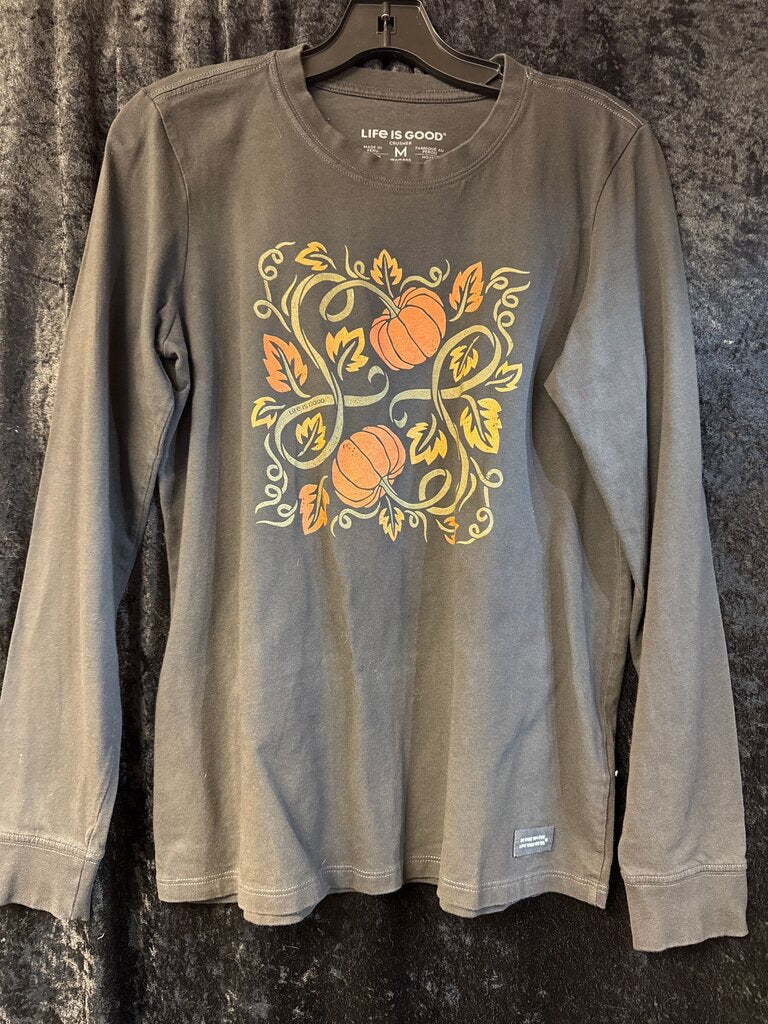 A stylish long sleeve t-shirt from Life Is Good featuring a vibrant pumpkin design, perfect for the autumn season.