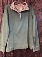 Stylish and comfortable green pullover fleece from Orvis with floral detail.