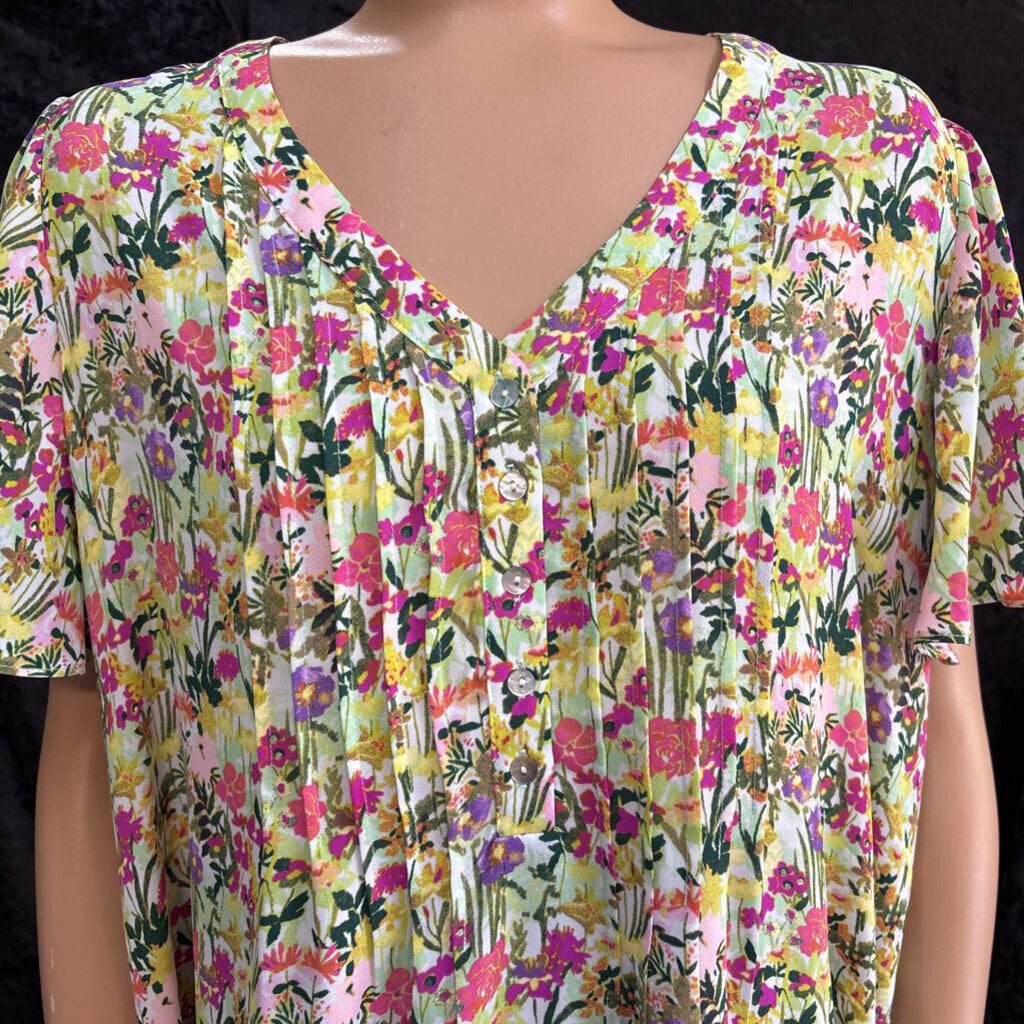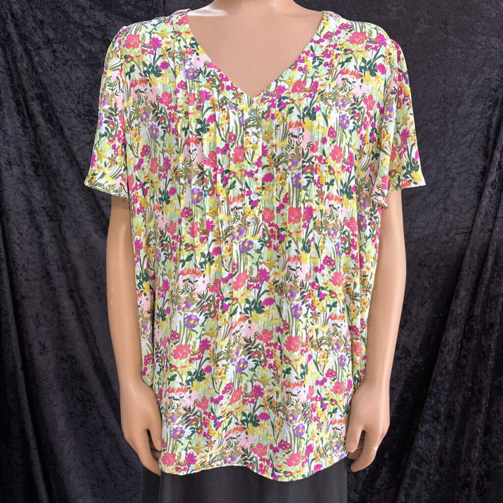 rose & olive ruffled cap sleeve flowered with pleats & buttons Women's Shirts 1X mint, pink, yellow, green, peach