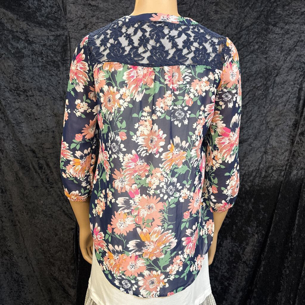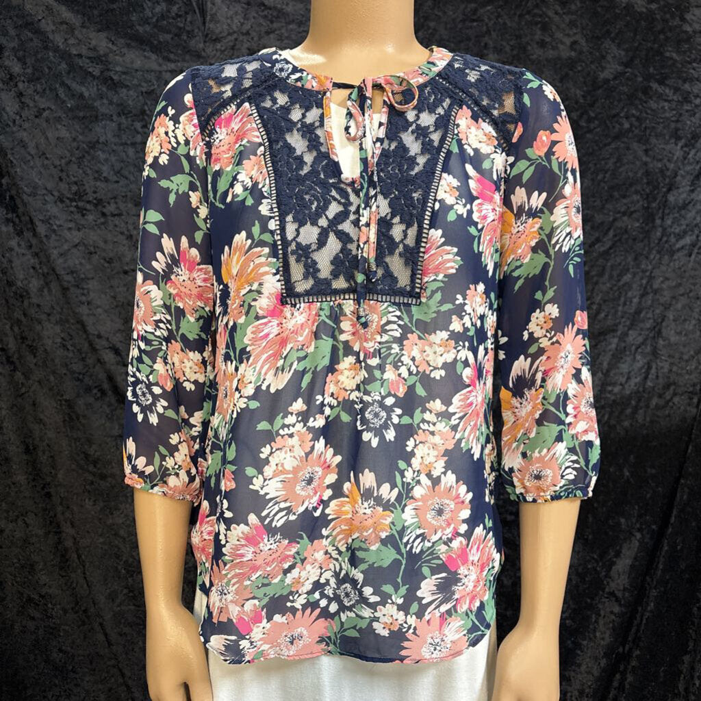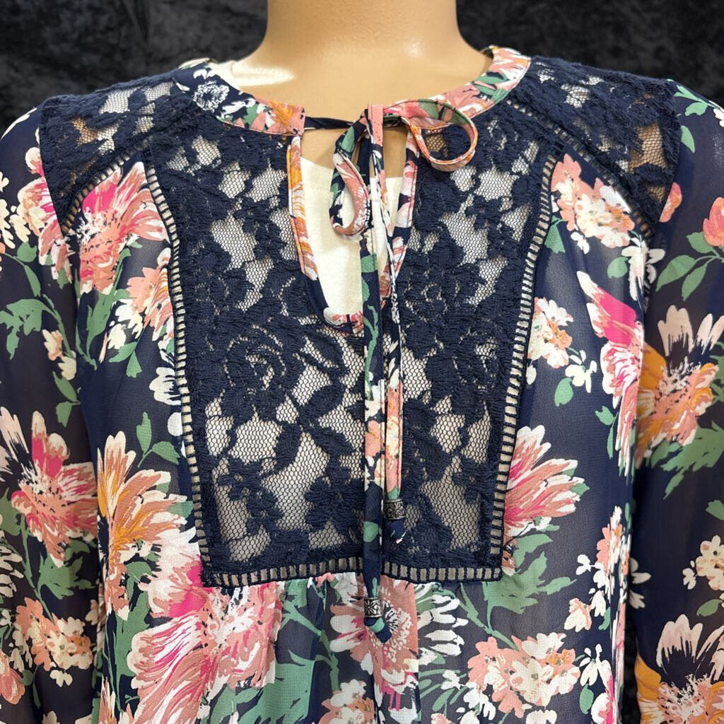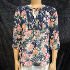 zac & rachel flowered with lace insert and tie with elastic sleeves Women's Shirts Petite S navy, white, pink, green
