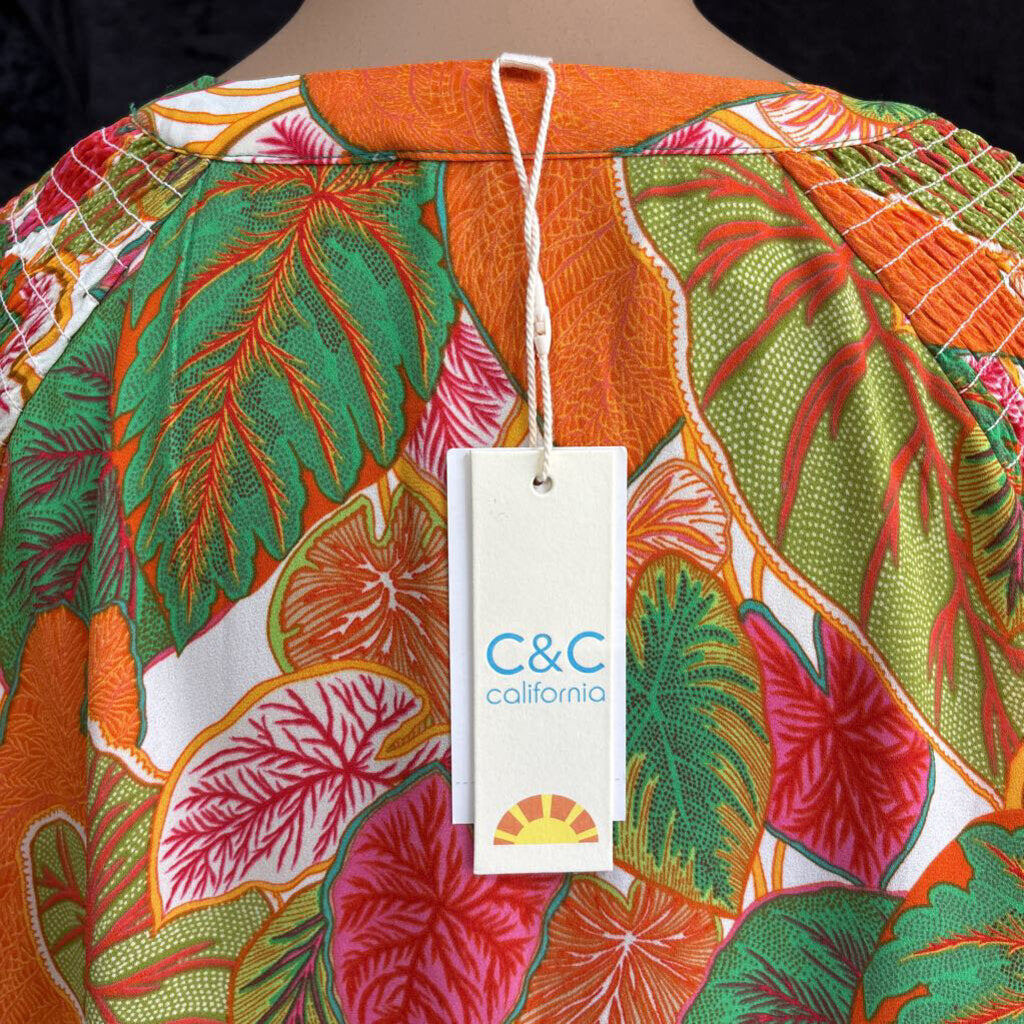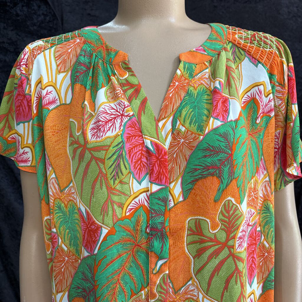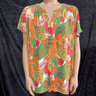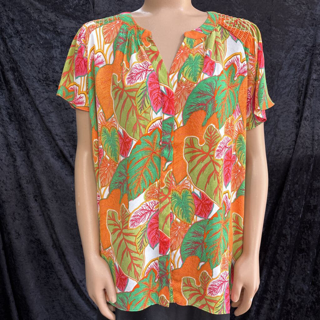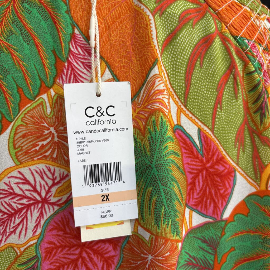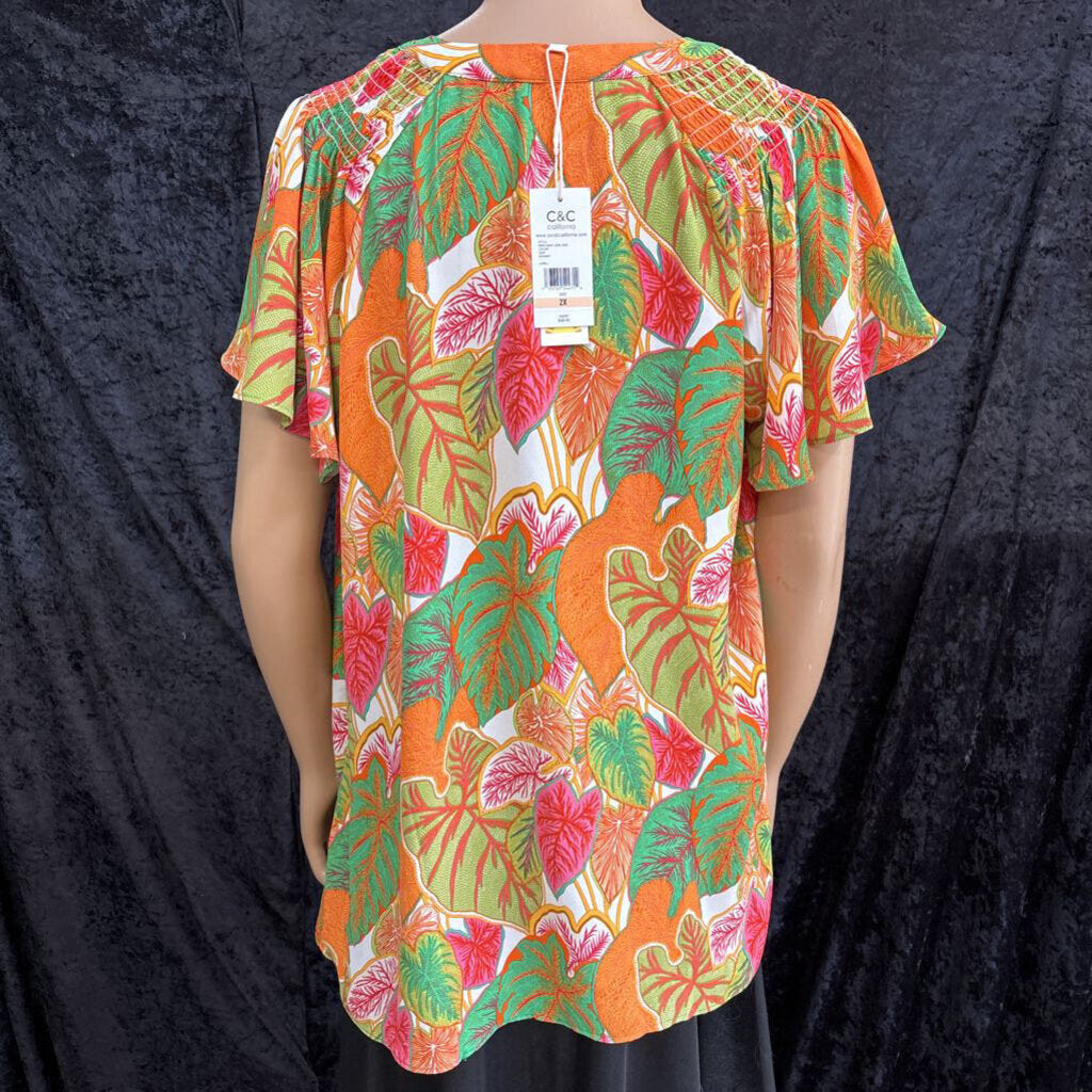 C&C California bright leaf printed hidden button Women's Shirts 2X pink, orange, greem white