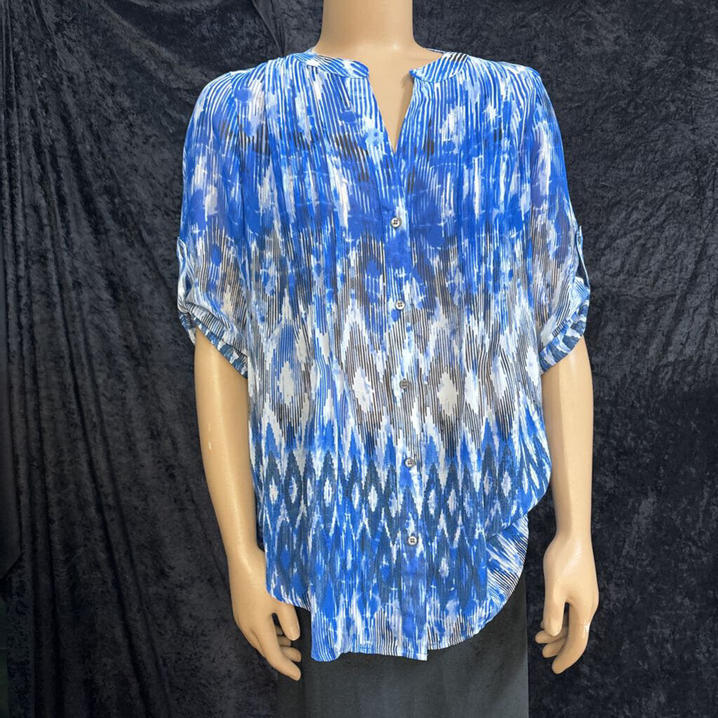 Chaus sheer blouse with stand up collar and tab sleeves Women's Shirts S blue, black, white