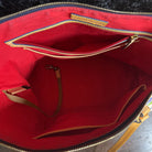 Leather exterior bag with floral pattern. Perfect for spring or summer events. Red interior with pockets and a zippered compartment.