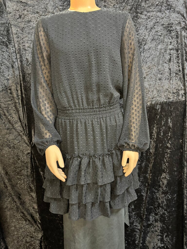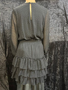 Stylish gray layered ruffle dress featuring long sleeves and a cinched waist, perfect for any occasion.