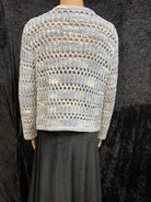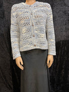 Stylish women's knit cardigan sweater with a beautiful open weave design, perfect for layering in cool weather.