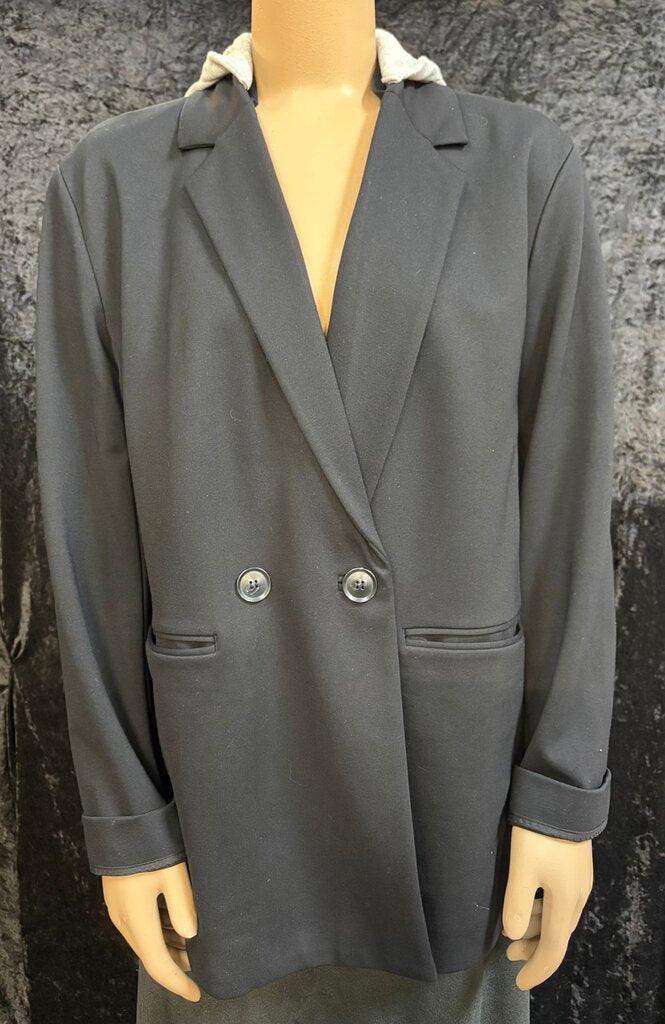 Stylish Lou & Grey black blazer featuring a comfortable hoodie, perfect for layering. Great for casual outings or as a chic office wear.