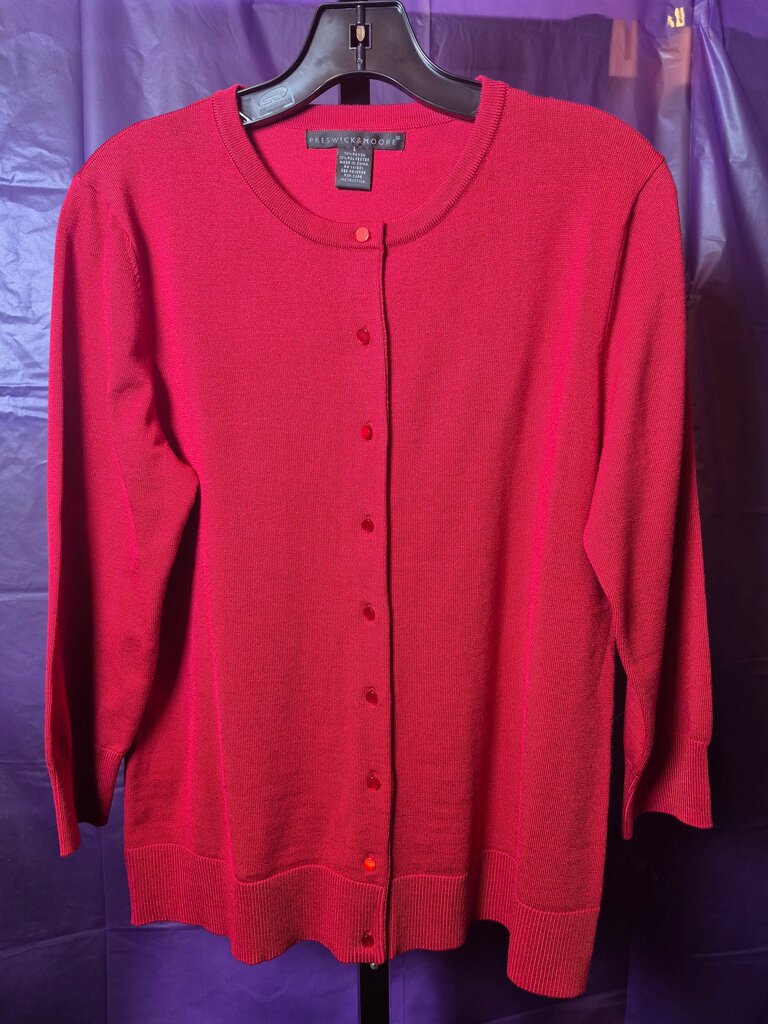 A stylish Preswick & Moore women's red cardigan that offers warmth and elegance, perfect for any occasion.